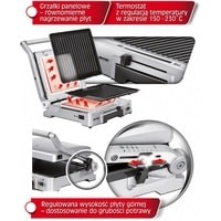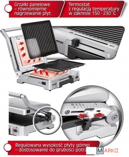 Регулируемая высота верхней пластины – подгонка по толщине запекаемого продукта.Нагревательные пластины и поддон для жира можно мыть в посудомоечной машине.