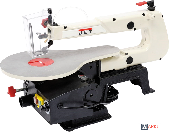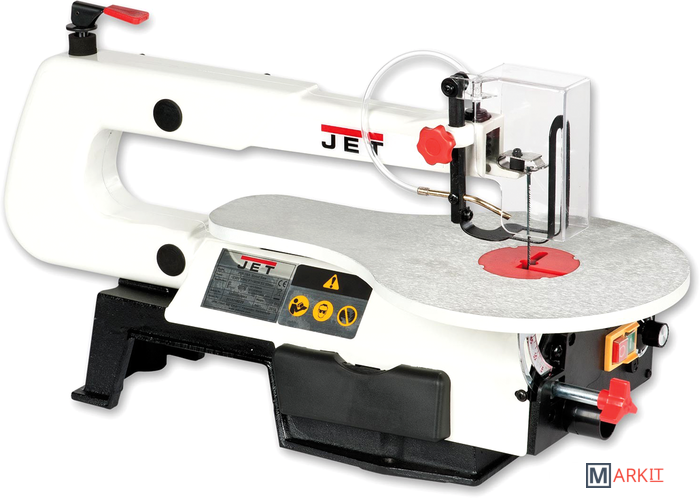 Jet JSS-16A – любительский станок для выпиливания сложных радиусов в не слишком крупных заготовках из древесины, ДСП, ДВП, фанеры или пластмассы. Модель представляет собой улучшенную модификацию хорошо известного лобзикового станка Jet JSS-16 и имеет ряд интересных конструктивных особенностей, выгодно отличающих ее от аналогов других марок. Прежде всего, это универсальность в отношении используемых полотен: можно устанавливать пилки как со штифтовым креплением, так и без него. Важно отметить удобное верхнее расположение рычага натяжения полотна. Новое усовершенствование в конструкции – возможность изменить ориентацию плоскости распила: вдоль или поперек продольной оси станка, смотря как удобнее или привычнее оператору.Частота ходов пилки: 550-1600 ход/мин